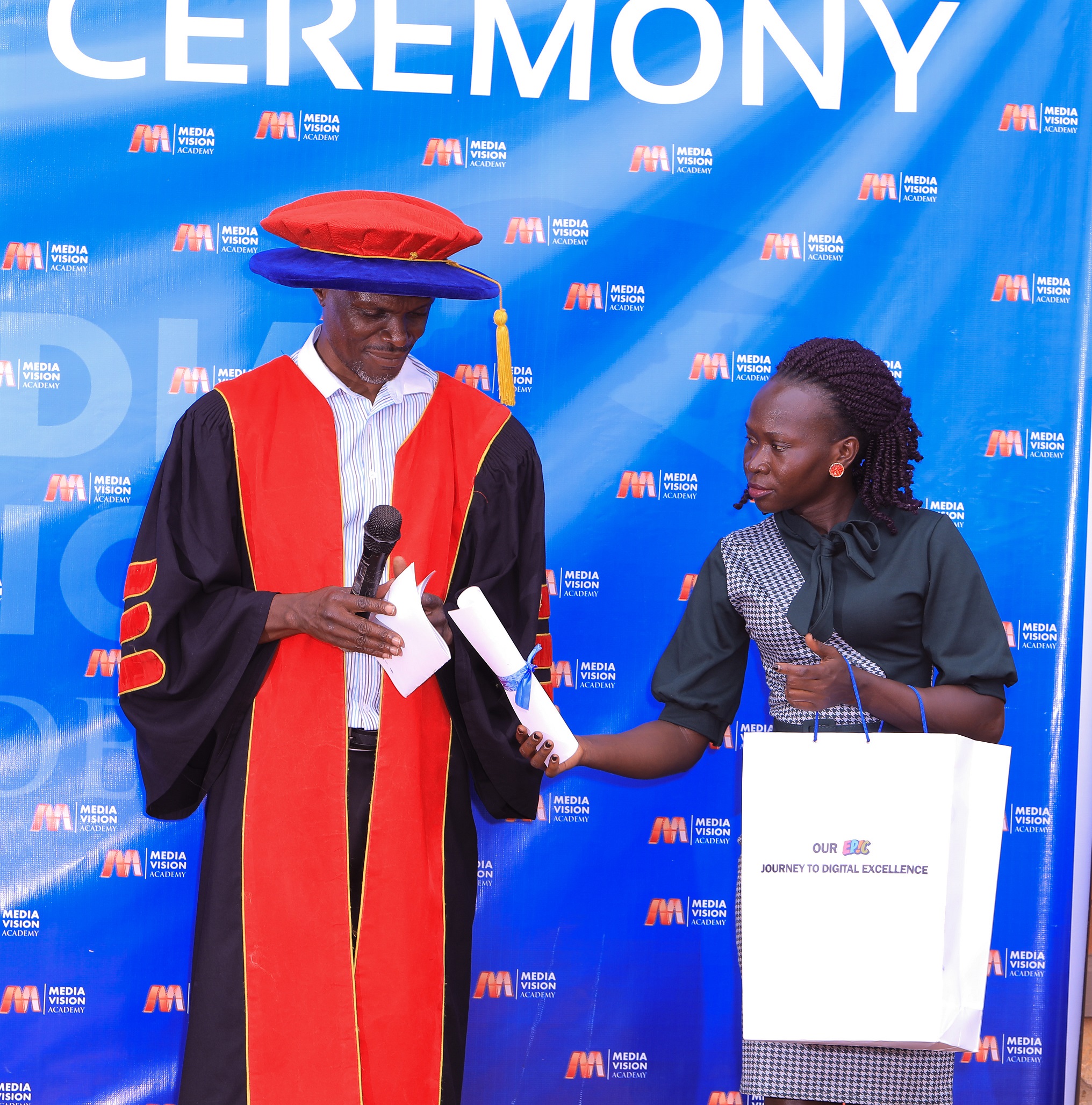 Next was the moment when the Director of Mediavision Academy presented the candidates for graduation, then, acknowledged by the Chairperson of the Board of Governors of the Academy, Dr. Ssemakula Joseph, and conferred by Ms. Milly Nabankema, the DIT Representative. Finally, the graduates received their completion certificates.